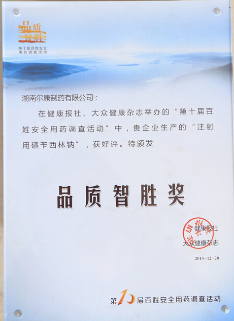 湖南爾康制藥榮獲“品質智勝獎” 爾康湘藥生產的“磺芐西林鈉”獲得百姓認可 12月20日,由國家衛生計生委藥政司指導,健康報社和大眾健康雜志主辦的第10屆百姓安全用藥調查活動總結大會在廣東省深圳市舉行。會上,湖南爾康湘藥制藥生產的“注射用磺芐西林鈉”,與廣州白云山制藥總廠、深圳華潤九新藥業等在內的30余個企業產品得到百姓認可,榮獲“品質智勝獎”。 據了解,此次評審評以健康報及門戶網站刊登調查問卷投票依據,由臨床專業人員、公眾投票產生,候選企業最后經組委會篩選、質量評估確定。因活動內容貼近群眾,接受調查的企業產品過硬,活動推出的“放心藥獎”評選一直堅持公正、公開的原則,評選過程嚴謹,透明,并且定期公示調查結果,從而獲得了社會公眾、醫藥行業的好評。 湖南爾康湘藥制藥生產的“注射用磺芐西林鈉”之所以能獲得百姓認可,這與爾康制藥多年來注重研發、注重生產工藝創新,秉持“專業成就未來、品質鑄就輝煌”的經營理念密不可分。在同類產品中,湘藥生產“注射用磺芐西林鈉”采用的是瓶凍凍干生產工藝,其工藝水平和產品質量堪比日本武田公司;另外,湘藥的青霉素類凍干粉針劑車間在2013年率先通過新版GMP認證,在品質保證方面更上臺階、領先于同類產品,亦得到醫生和患者的認可。 對于患者來說,在抗生素泛濫使用的醫療環境下,注射用磺芐西林鈉作為低代次的青霉素類藥品,比頭孢菌素類(3代、4代)、碳青霉素類等抗菌藥品的安全性更好,不易產生耐藥性。