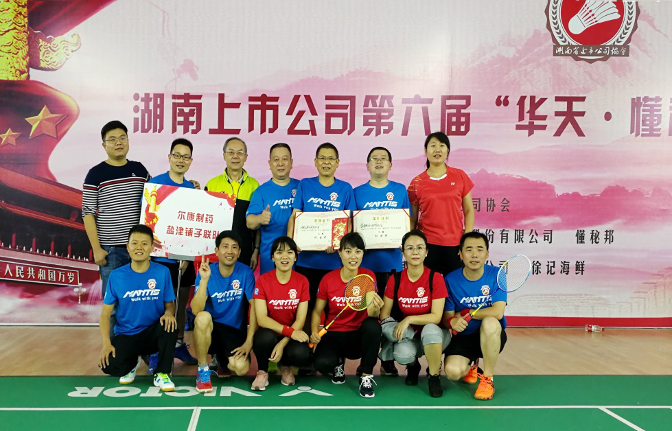 10月19日-20日,湖南上市公司第六屆“華天-懂秘邦”杯羽毛球團體賽在省人民體育場隆重舉行,來自全省各地40余家上市企業參加比賽。爾康制藥和鹽津鋪子16名運動員組成聯隊參與了本次羽毛球盛會。