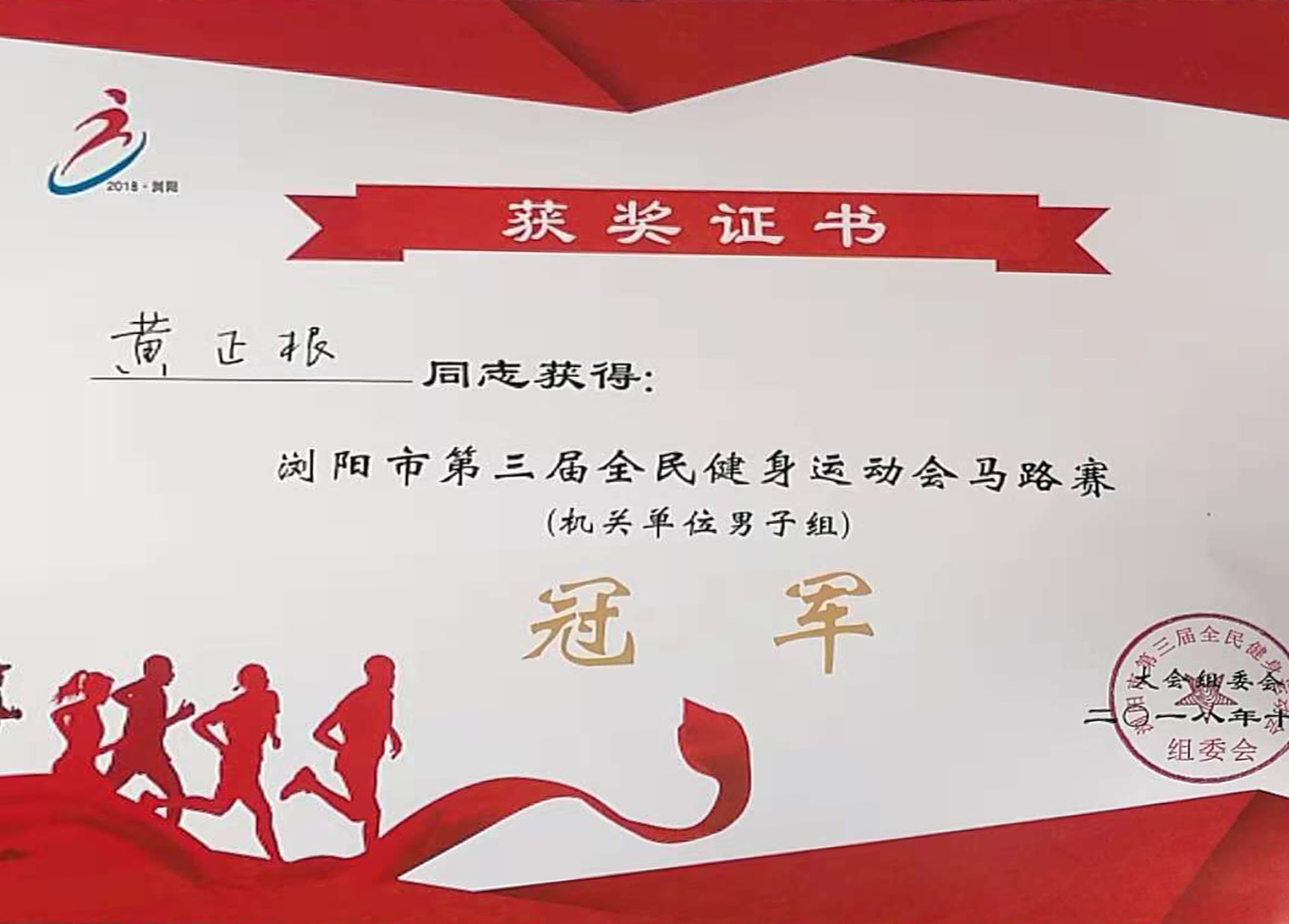 11月9日,在瀏陽經開區職工運動會男子長跑比賽中,黃正根以十七分零六秒的成績第一個沖過終點,為公司爭得了第一塊金牌。前些日子,在瀏陽市第三屆全民健康運動會馬路賽比賽中,黃正根代表瀏陽經開區參加比賽,同樣也獲得了冠軍。