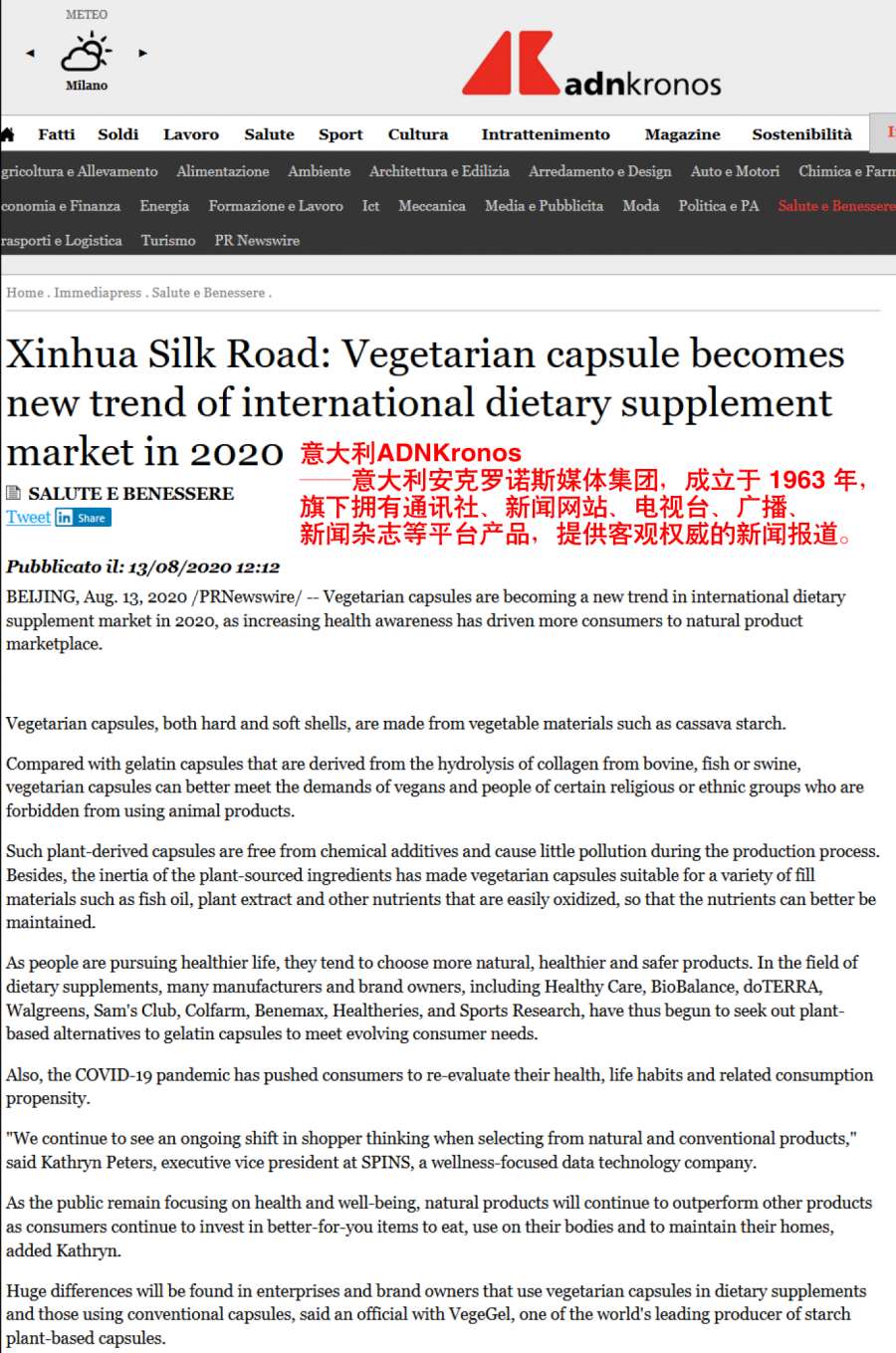 日前,植物膠囊在國際上再度引起關注,一篇題為《Vegetarian capsule becomes new trend of international dietary supplement market in 2020》探討淀粉植物膠囊或成2020年膳食補充劑新趨勢的文章,被北美Fox、Yahoo! Finance、Business Insider: Markets Insider 、Seeking Alpha、Canadian Business Journal,歐洲Xpert、Notre Siècle、FinanzNachrichten.de、ADNKronos 、Europa Press 、PAP等超40余國家、全球近900家國際媒體轉載發布。